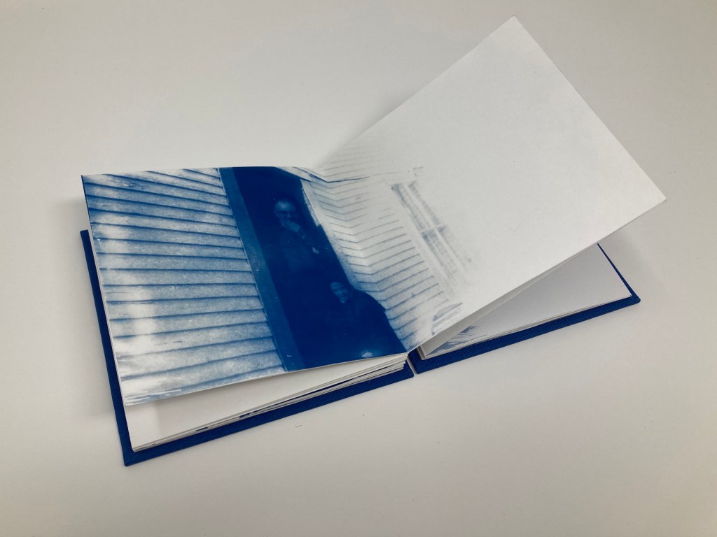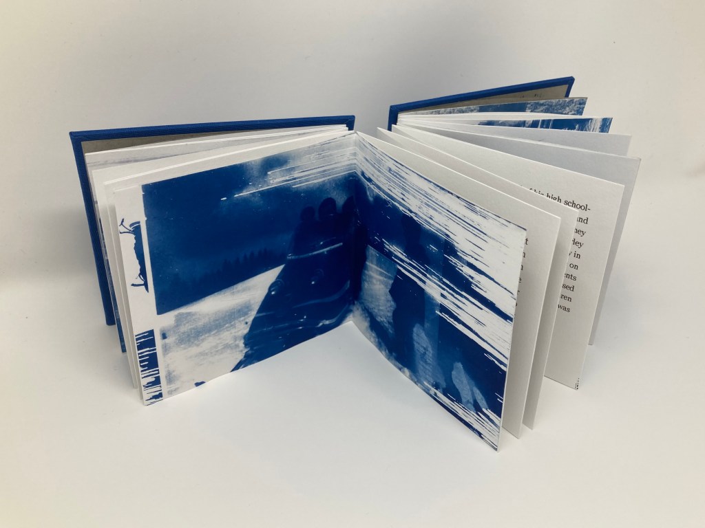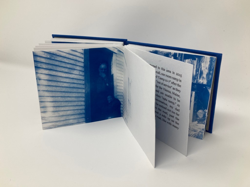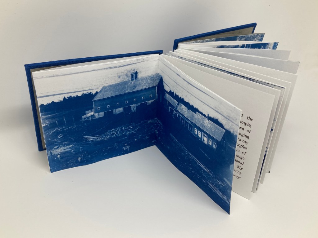 Churches of Southwestern Piscataquis County, tipped accordion artist’s book with cyanotype, 2021